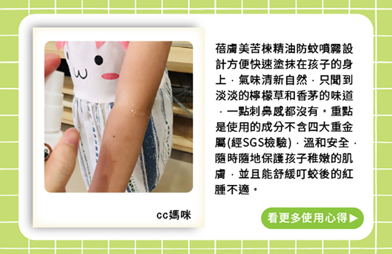 保有原本的天然植萃成份,隨時隨地保護孩子稚嫩肌膚,在肌膚表層形成透氣的保護膜,舒緩叮蛟後的紅腫不適。不油膩質地,讓肌膚維持長時間的防護和保濕作用,大人小孩用的安心、放心。